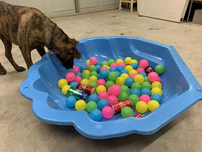 Fill a kid sized pool with plastic balls, empty plastic drink bottles or recycled paper scrunched into a ball. Then sprinkle their food inside, mix it all up and let your dog have a go!