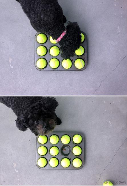 Fill the cavities of a muffin tin with food. Then cover each cavity with a tennis ball and let your god have a go at figuring out how to get to their food.